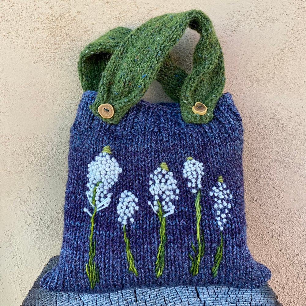 A profusion of Rocky Mountain wildflowers embroidered on hand knitted wool pouch. Knitted handles attached by twig buttons. Maybe this old fashioned purse was carried on the wrist of your beloved grandmother!