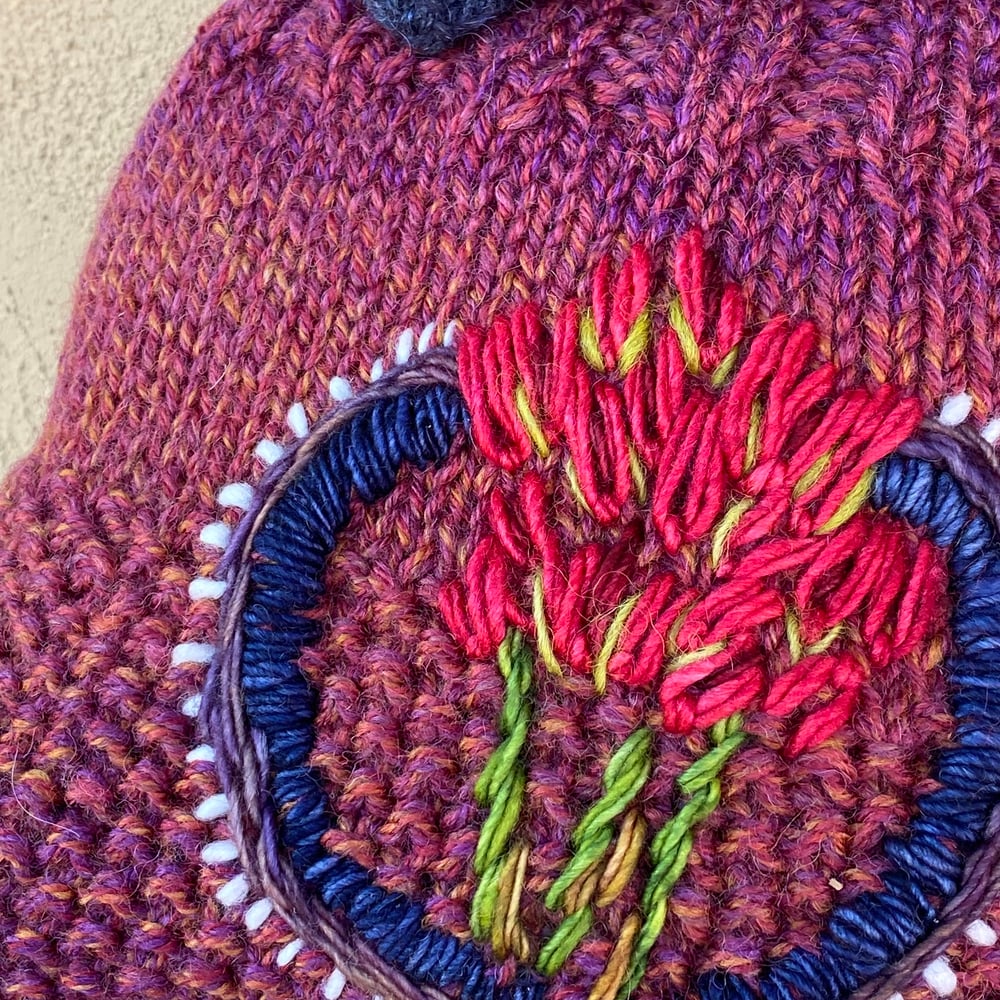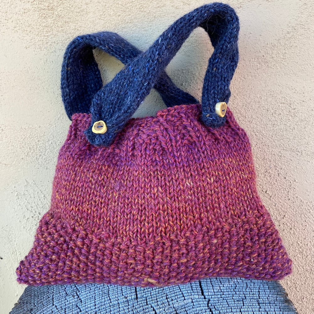 A profusion of Rocky Mountain wildflowers embroidered on hand knitted wool pouch. Knitted handles attached by twig buttons. Maybe this old fashioned purse was carried on the wrist of your beloved grandmother!